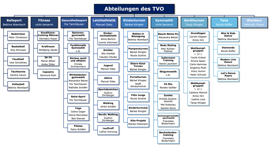 Du willst Dir zunächst einen Überblick über unser Angebot verschaffen? Dann ist hier nochmal das Organigramm für dich. Dort findest du alle Abteilungen und Kurse, die bei uns aktuell angeboten werden.