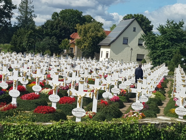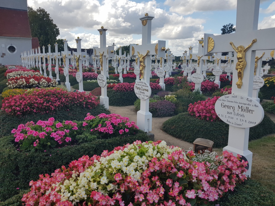 Alle Gräber sind gleich und haben dieselbe Größe und denselben Aufbau und sind in Reihe und Glied aufgebaut. Nur die Bepflanzung variiert ein klein wenig.