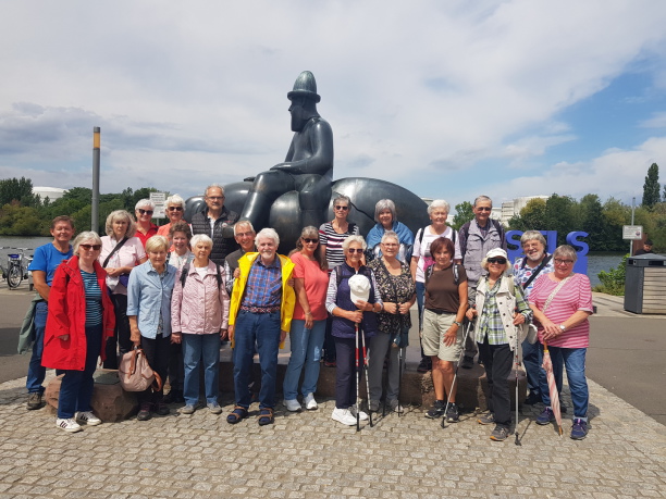 Das Foto zeigt die Gruppe am Leinreiter-Denkmal - eine 1993 geschaffene Bronzeplastik die in Rüsselsheim auf dem Landungsplatz am Mainufer steht.