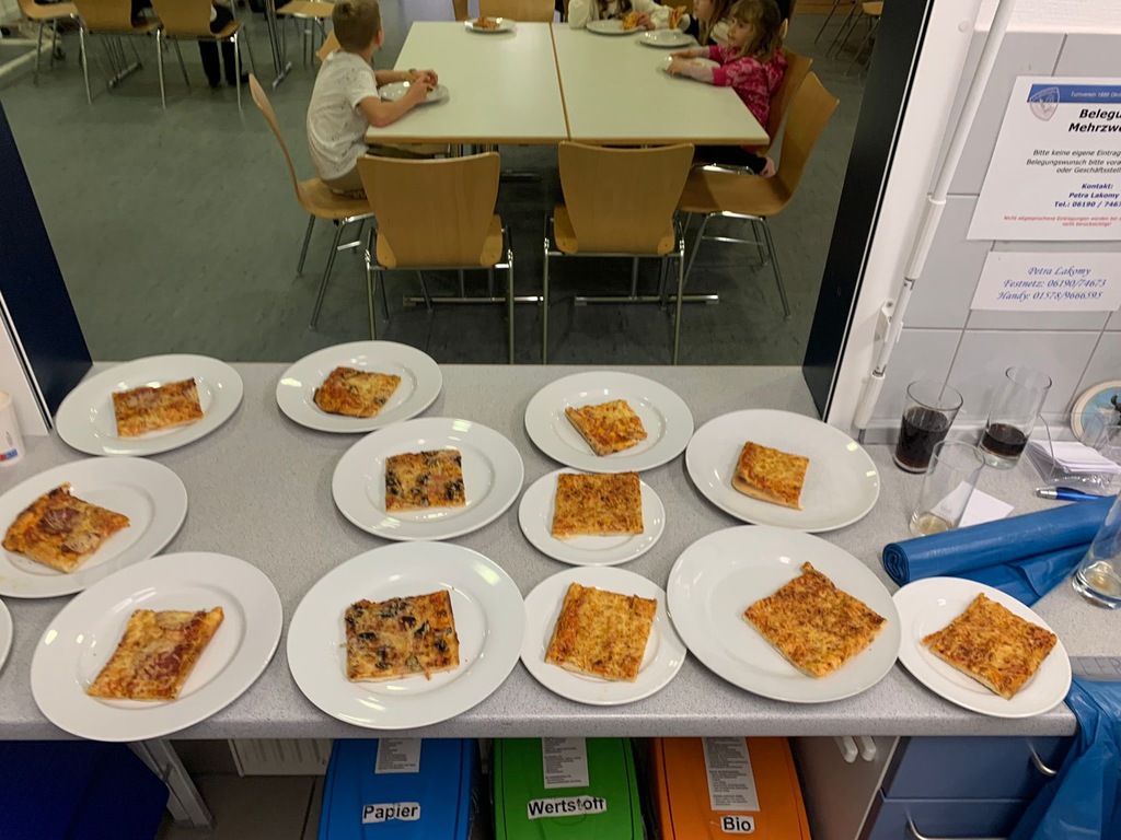 Gegen 18 Uhr füllte sich die Halle mit sage und schreibe 100 (!) teilnehmenden Kindern, die mit Pizza und Snacks versorgt wurden,