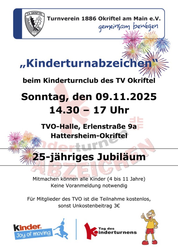 Zum 23. Mal waren die 3 Turnhallen beim TVO fürs Kinderturnabzeichen am Sonntag, den 12.11.24 ab 14:30 bis um 17 Uhr geöffnet. Im Zeitraum konnten Punkte an verschiedenen Stationen gesammelt werden. Fast 50 Kinder, von 3 - 11 Jahren, waren der Einladung gefolgt, wobei auch 6 Nichtmitglieder sich turnerisch umgeschaut hatten. Die 20 Helfer (inkl. der 15 Stationsbetreuer) hatten ab 12:30 begonnen, die 30 Stationen, die die Grundfertigkeiten im Kinderturnen schulen, vorzubereiten um sie dann während der Veranstaltung zu betreuen. Zur Überbrückung, bis die Urkunden geschrieben sind, wurden wieder die bekannten Bewegungslieder zusammen getanzt. Ergebnis des sportlichen Nachmittags waren glückliche Kinder und dankbare Eltern....